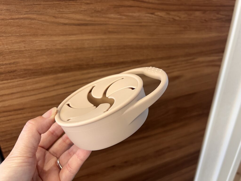 このカップに入れてお菓子をあげるとこぼしてしまう頻度が激減するので、シェルブランケットの汚れ防止になります。